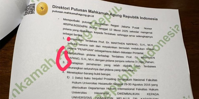 3) Foto kopi salinan buku Buku Prosiding Simposium Nasional Fakultas Hukum Universitas Hasanudin tanggal 29-30 Agustus 1018; Indonesi4) Foto kopi salinan Joumals dengan Judul Law Enforancement Of Crime of Aggression in the Angle of Rome Statute Prespectives and Challenges Dr. MARTHEN NAPANG, S.H., M.H. Senior Lecturer at International Law Departemen, Faculty of Law Hasanudin University, marthennapang@gmail.com, www.iiste.org; Indonesia, yang ditujukan Email: kepada Rep Republik. Demikian bunyi amar putusan PT. Jakarta pada, Hal. 20 dari 25 hal. Putusan Pidana Nomor 66/PID/2025/PT DKI Agung.