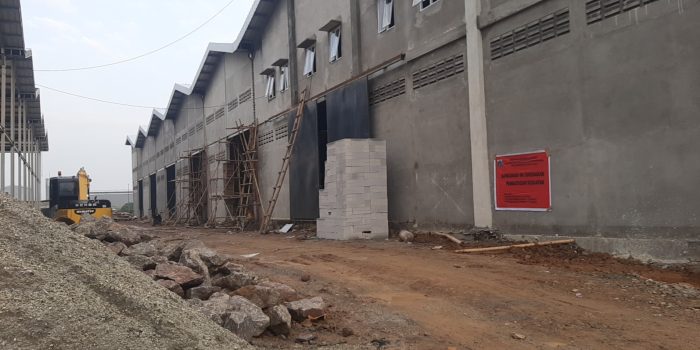 Banner berwarna merah berlogo Jaya Raya bertuliskan “Pembatasan Kegiatan Kerja” tampak terpasang di tembok bangunan gudang tersebut. Dalam banner juga dicantumkan dasar hukum berupa Undang-Undang Nomor 6 Tahun 2023, Peraturan Pemerintah Nomor 16 Tahun 2021, dan Peraturan Pemerintah Nomor 21 Tahun 2021.