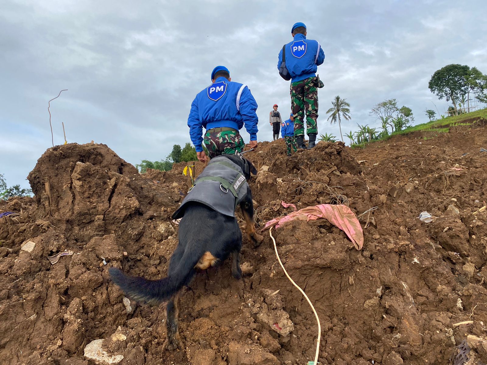 Cianjur, Hariansentana.com – Unsur Satgas Murai II dengan satuan Brigan dari Satpom Lanud ATS kembali mencari korban hilang di Cianjur. Dengan didukung dua ekor satwa Brigade Anjing Satuan Polisi Militer Lanud Atang Sendjaja (Brigan Satpom lanud ats) kembali mencari korban hilang di Desa Cijedil, Kecamatan Cugenang, Kabupaten Cianjur. Minggu, (11/12/2022).